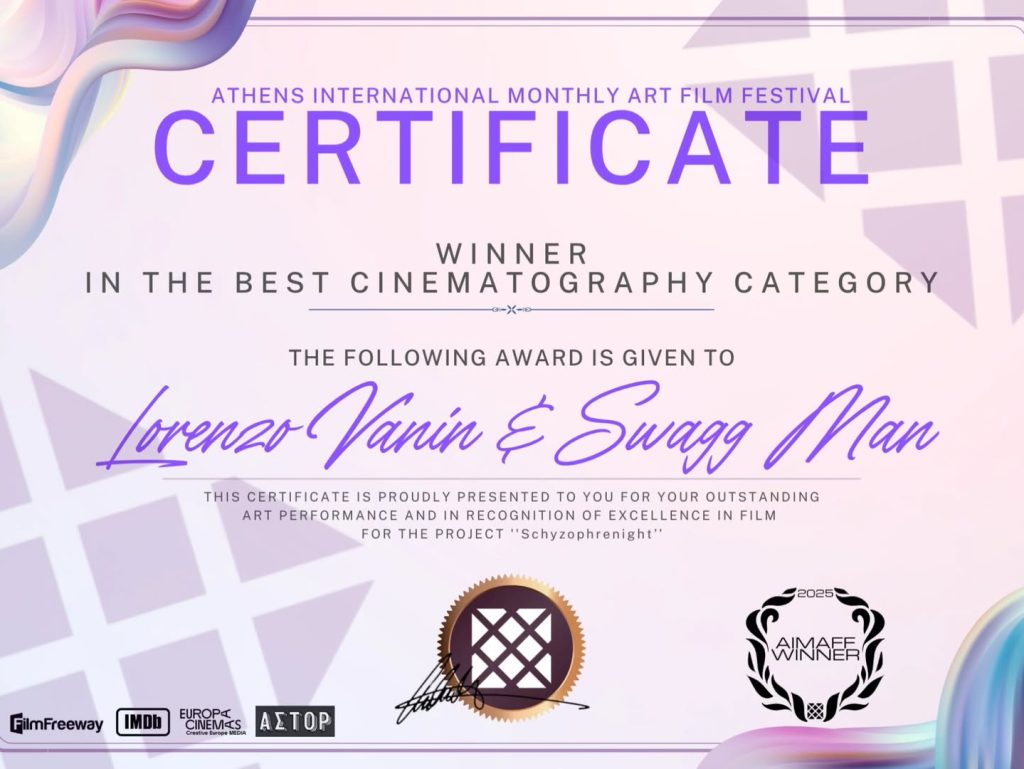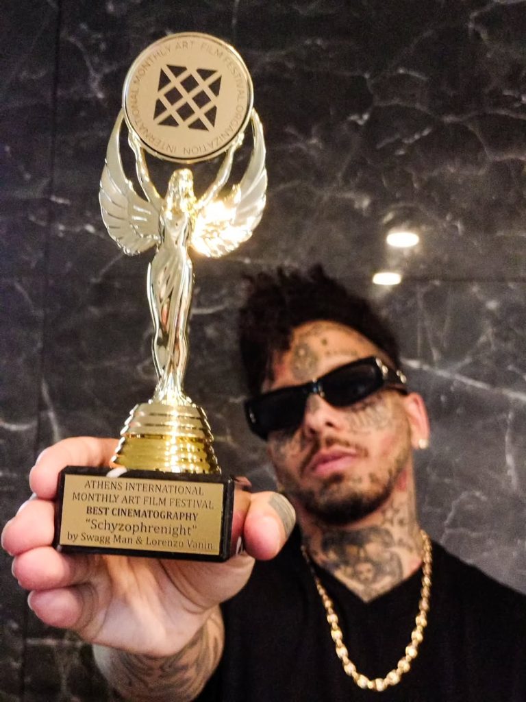 Artiste aux multiples facettes, Swagg Man marque une entrée fracassante dans le monde du 7ᵉ art. Son tout premier court-métrage, “Schyzophrenight”, réalisé en collaboration avec le talentueux Lorenzo Vanin, vient de remporter le Best Cinematography Award au prestigieux Athens International Monthly Art Film Festival (AIMAFF).