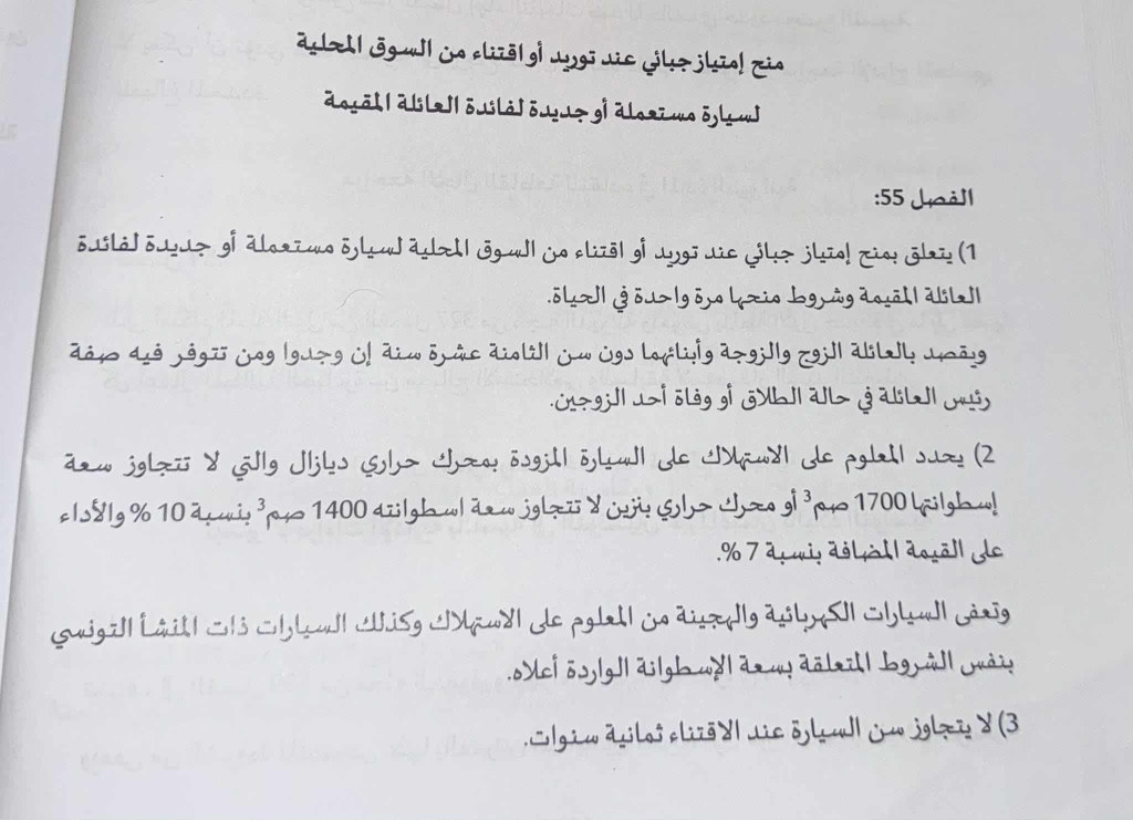 ويُقر الفصل 55 بتوريد سيارة لكلّ عائلة دون دفع معاليم ديوانية لا يتجاوز عمرها 8 سنوات، ولا يمكن الجمع بينها وبين السيارة الشعبية، ولا يُمكن التفويت فيها لمدة خمس سنوات من تاريخ توريدها، على أن لا يتجاوز عدد هذه السيارات نسبة 10% من السيارات الموردة.