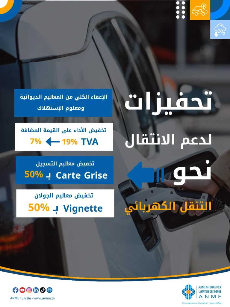 في إطار دعم الانتقال نحو وسائل نقل صديقة للبيئة، تم إقرار جملة من الامتيازات لفائدة السيارات الكهربائية والسيارات الهجينة القابلة للشحن، تتمثل في:
