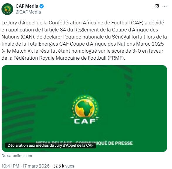 وجاء القرار بعد اجتماع لجنة الاستئناف التابعة للكاف، التي قررت تطبيق المادة 84 من لوائح بطولة كأس أمم أفريقيا، واعتبار منتخب السنغال خاسرًا في المباراة النهائية.